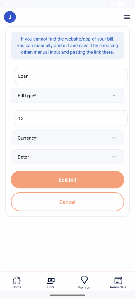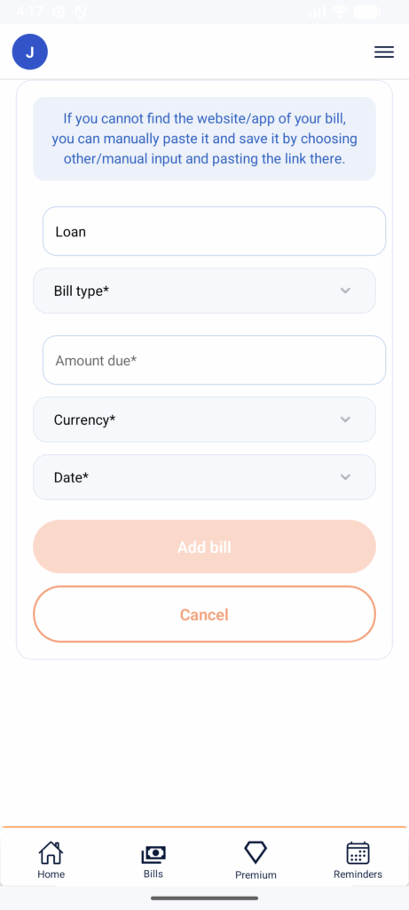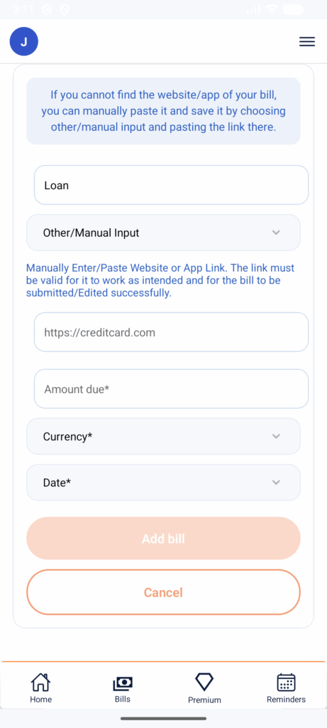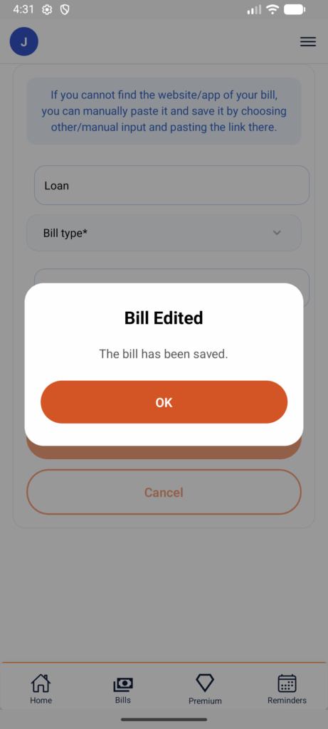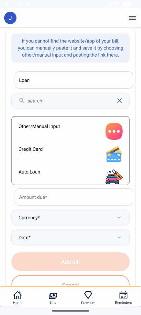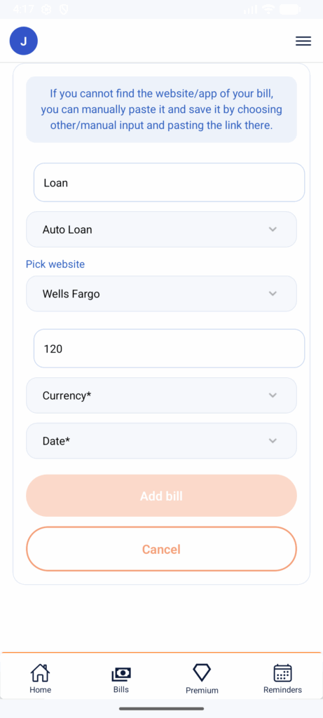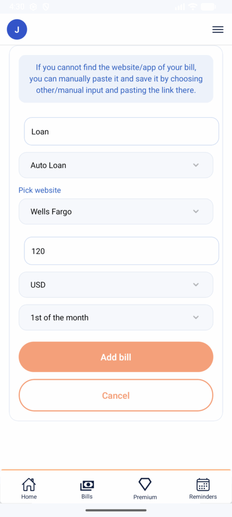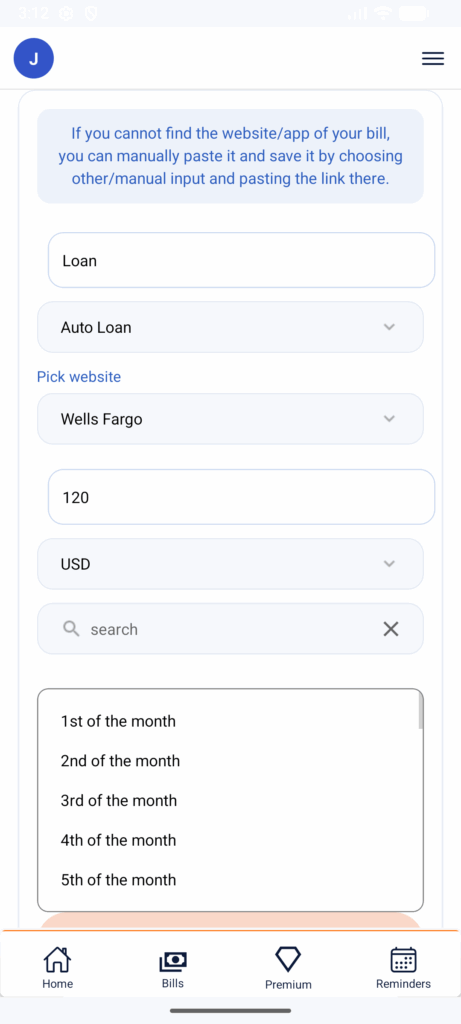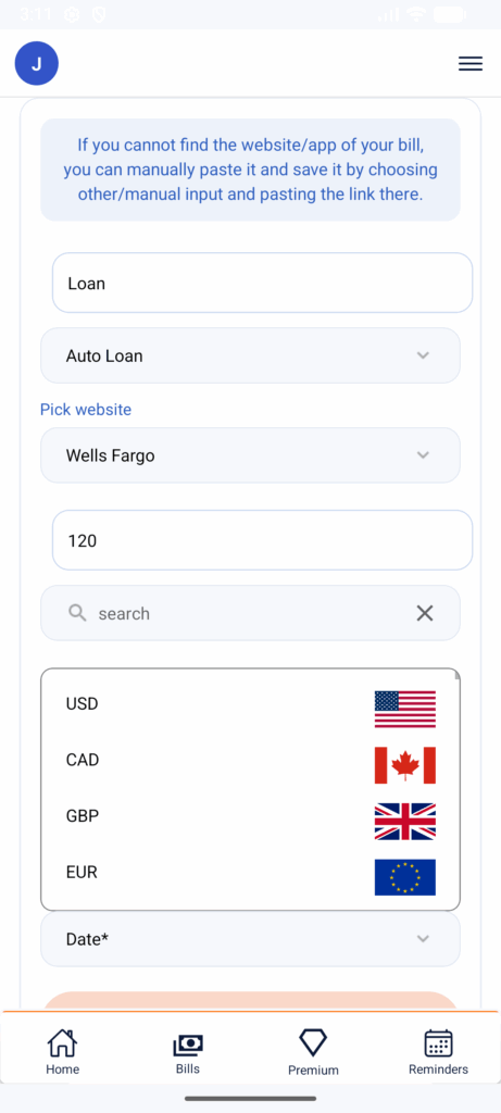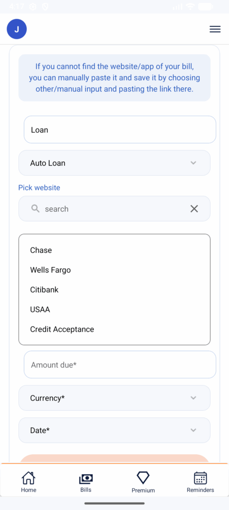 Pick the website/app. If your bill’s website is not on the app yet, you can manually past it on the app. Make sure to paste the whole link for it to work such as https://billstreasuryapp.com/ and not just the website domain name or app name. We will be adding more options as we go and will have your website/app link available soon.