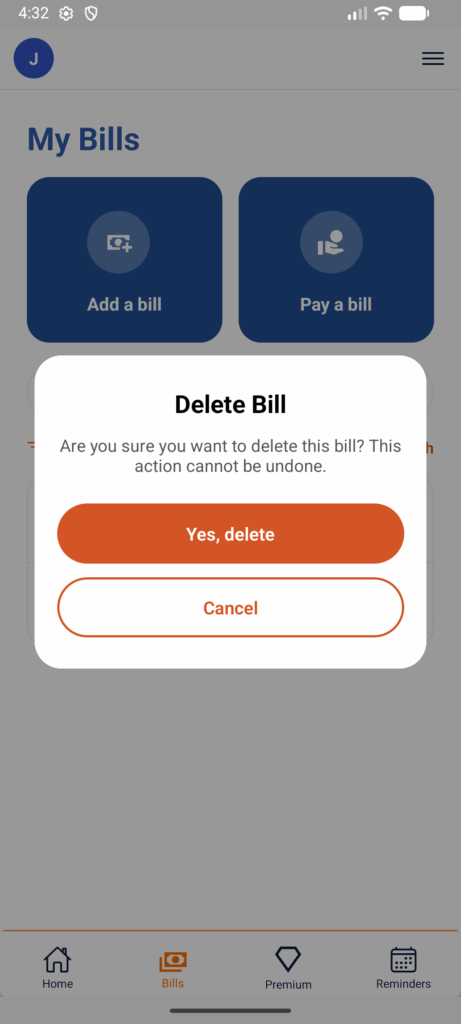 To delete a bill, click on the trash to delete it. Click on ‘Yes, delete’ to confirm deletion.