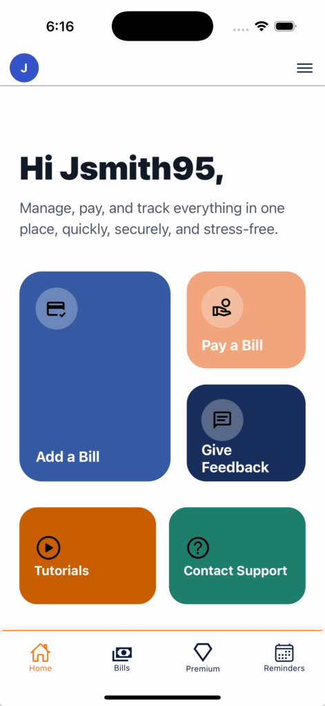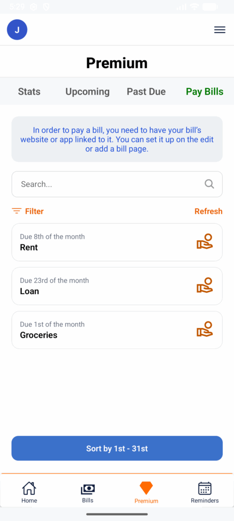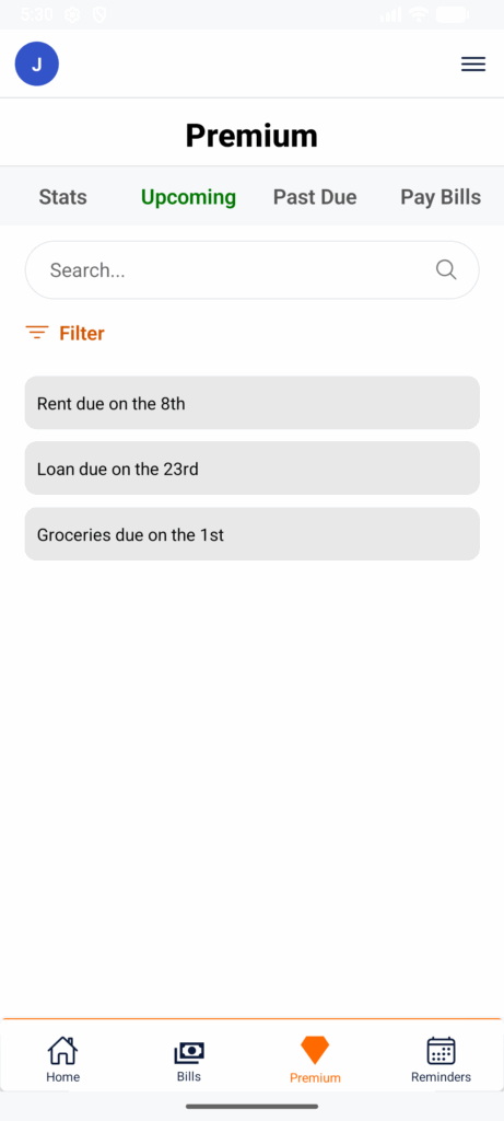 My stats page has three sections. Stats, Upcoming, Past Due and Pay Bills