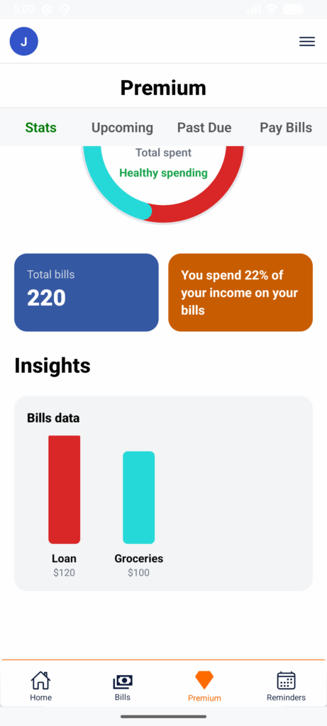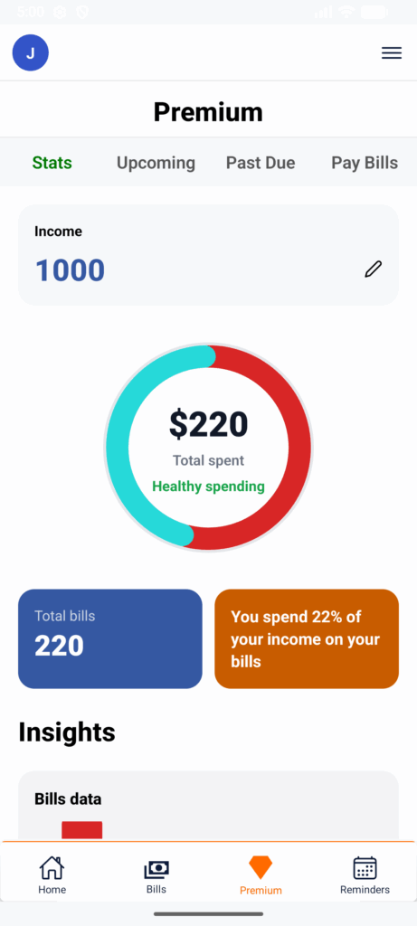 Stats lets you add your income, view the total amount you spend on bills, see what percentage of your income goes toward expenses, and review a breakdown of your spending by category.